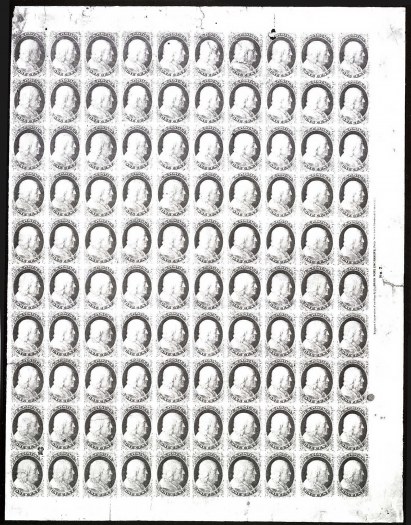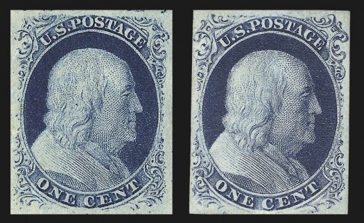 Philatelists in the early part of the 20th century examined countless thousands of 1¢ 1851-57 Issue stamps, including blocks and sheets, and successfully reconstructed the stamps’ positions on the original plates. The plates are numbered in chronological sequence: Plate 1, 1 Late (the reworked first plate), 2, 3 and 4 – the plates used to make imperforate stamps – followed by Plates 5, 7, 8, 9, 10, 11 and 12 (Plate 6 was discarded), which were used only to make perforated stamps.